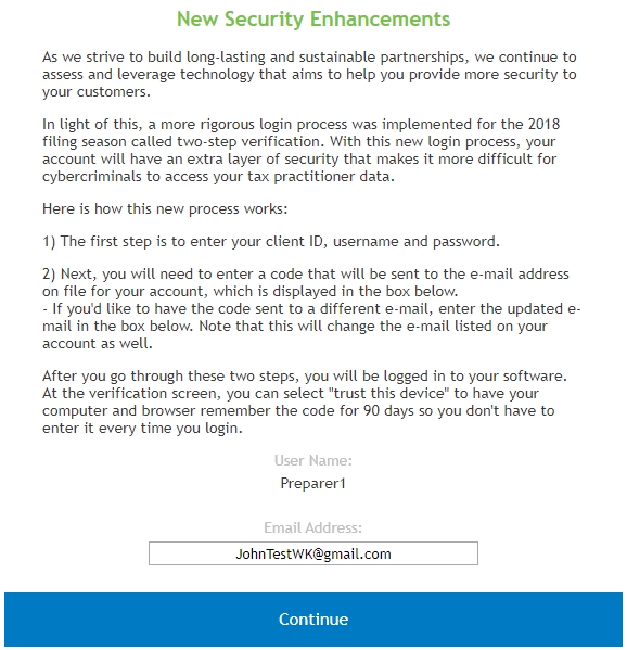 In light of this, a rigorous log in process is used called two-step verification. With this log in process, your account has an extra layer of security that makes it more difficult for cybercriminals to access your tax practitioner data.