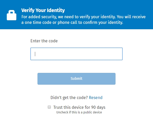 - Optional: Select the Trust this device check box if you wish. The Trust this device feature is suitable if you often use the same device and/or browser to access the website. It enables the system to remember (for 90 days) the particular device and/or browser you are using, so you do not have to go through the verification process every time you log in to the website. The next time you log in using that device and/or browser, you will bypass the 2-Step Verification page and therefore, not have to enter a code. For security reasons, this feature works for 90 days for each device and/or browser you add. When the 90 days are up, you will need to go through the verification process once again.